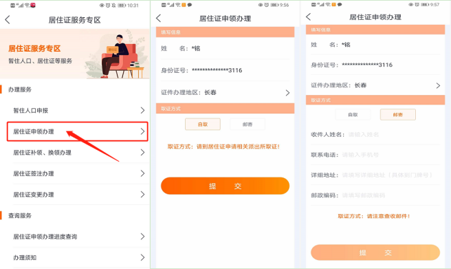已在吉林省办理过居住证,因遗失、损坏等原因需要补领、换领,填写基本信息后可以选择“自取”或“邮寄”的方式取证,邮寄需要填写收件人相关信息,到付邮寄费用。
