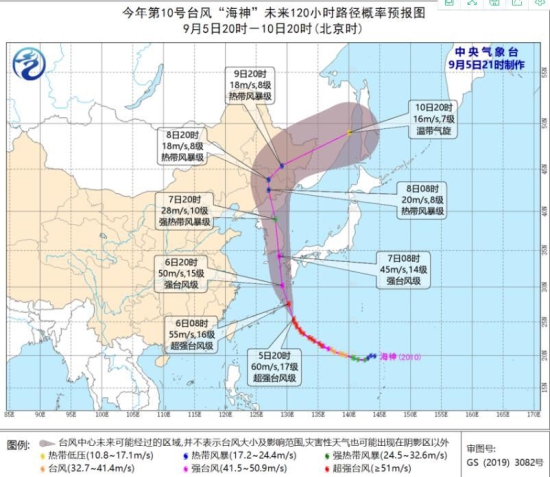 受“海神”影响,5日至9日,我国东部海区将自南向北出现6~9级大风,其中东海中东部的风力有10~11级,台风中心经过的海域风力可达12~17级;7日至9日,辽宁沿海、吉林中南部、黑龙江中南部将有6~7级大风,吉林东部和黑龙江南部的部分地区阵风8~9级,吉林东部局地可达10级。