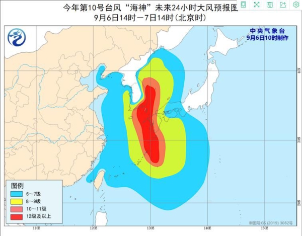 预计,“海神”将以每小时30公里左右的速度向北偏西方向移动,逐渐向日本西南部到朝鲜半岛南部一带沿海靠近,将于明天(7日)凌晨掠过日本九州西部近海,明天中午前后在朝鲜半岛南端登陆或擦过朝鲜半岛南部沿海北上,预计8日移入我省。根据当前气象资料分析,10号台风“海神”将于8日上午从我省东部一带移入,并自东向西给我省带来强风雨影响。