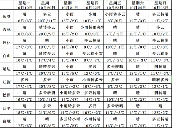 10月18日,中国吉林网从吉林省气象部门了解到,未来一周(10月19-25日),全省平均气温6.7℃左右,比常年4.9℃偏高。其中,西部平均气温7.0℃左右,中部平均气温8.0℃左右,东部平均气温5.0℃左右。