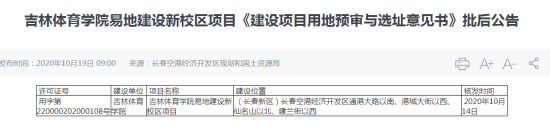该公告显示:为改善吉林体育学院基本办学条件,推动学校长期健康发展,原则同意吉林体育学院易地建设新校区项目建设。新校址选在了长春空港经济开发区,位于通港大路以南、港城大街以西、仙名山以北、建兰街以西,是长春空港经济开发区行政、文化核心区。