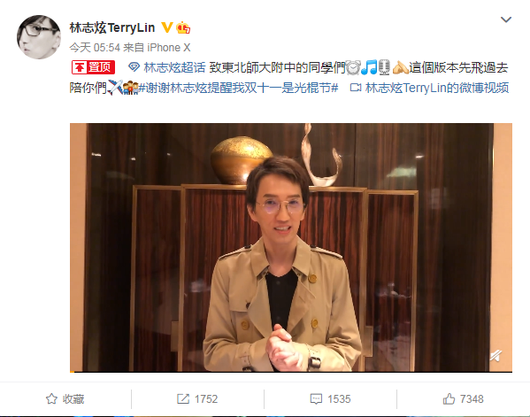 11日5时54分,林志炫通过微博账号林志炫TerryLin发文,致东北师大附中的同学们……后微博置顶!