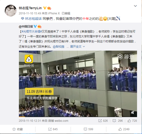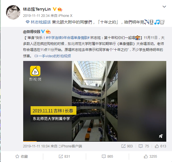 Olivia小颖子:#林志炫与东北师大附中的十年之约#真好啊!当年在青华校区扯脖子唱歌的我,怎么也没想到有一天林志炫可以来!!在附中读书可太幸福了!祝大家光棍节快乐,是不是单身都要快乐