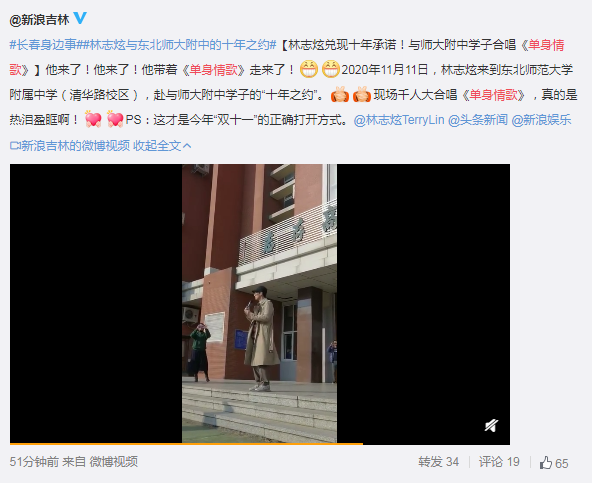 长春教育八卦阵:#林志炫与东北师大附中的十年之约#他来了他来了!!!2020年11月11日下午,@林志炫TerryLin 到达东北师大附中与附中学子共赴十年之约!在师大附中青华校区的操场上合唱《单身情歌》!
