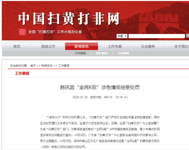 16日,中国吉林网据全国“扫黄打非”工作小组办公室网站消息,近期,全国“扫黄打非”办公室部署广东省“扫黄打非”部门,对媒体报道反映的“全民K歌”APP传播色情低俗歌曲、青少年模式形同虚设等突出问题进行查处。10月28日,广东省“扫黄打非”办公室联合省网信办约谈腾讯公司,责令全面整改。10月29日,深圳市南山区文化广电旅游体育局对运营“全民K歌”的腾讯音乐娱乐(深圳)有限公司作出相应行政处罚。