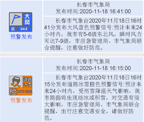 说过冻雨,再说说天气,长春市气象台2020年11月18日16时15分发布道路冰雪橙色预警信号:预计未来24小时内,受雨雪降温天气影响,长春市路面将出现结冰或积雪,对交通有很大影响,市应急管理局、市气象局联合提醒,出行注意交通安全,请做好防范。