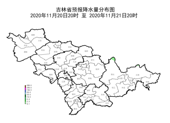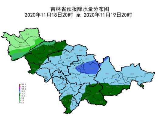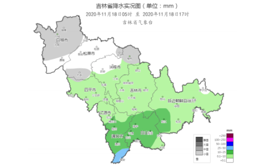 11月18日05时-11月18日17时,通化、白山、长白山保护区出现中到大雨,长春南部、四平、辽源、吉林、延边出现小雨, 白城、松原东部与南部、长春北部出现小雪。全省平均降水量5.9毫米,地区平均降水量如下:白山17.9毫米,通化17.3毫米,长白山保护区14.9毫米,辽源5.7毫米,吉林3.2毫米, 四平1.4毫米, 延边4.0毫米,其它地区不足1毫米。