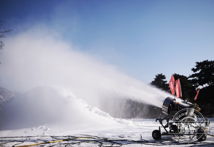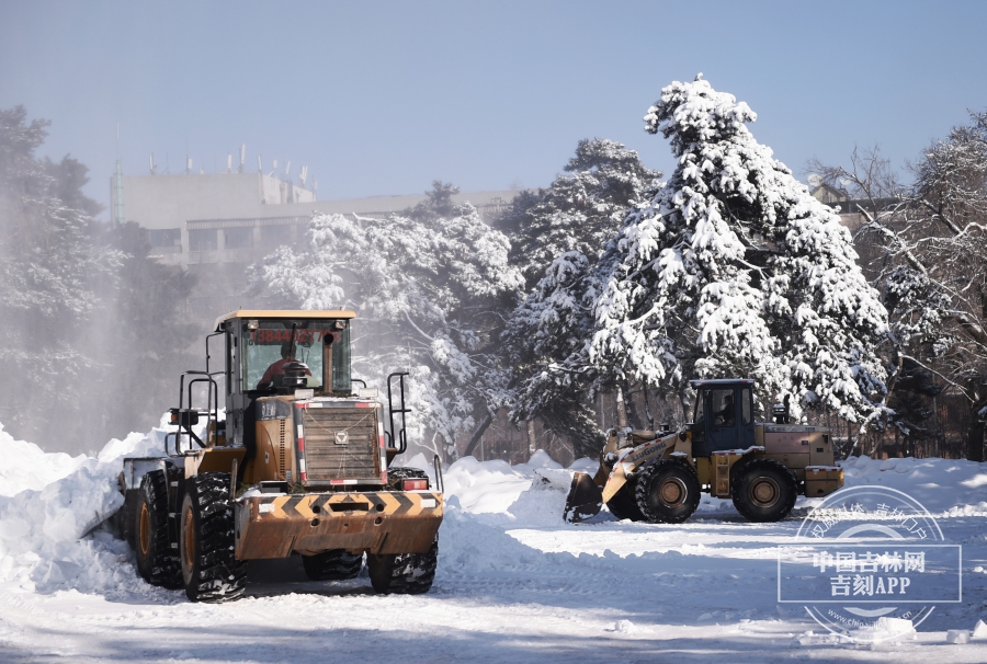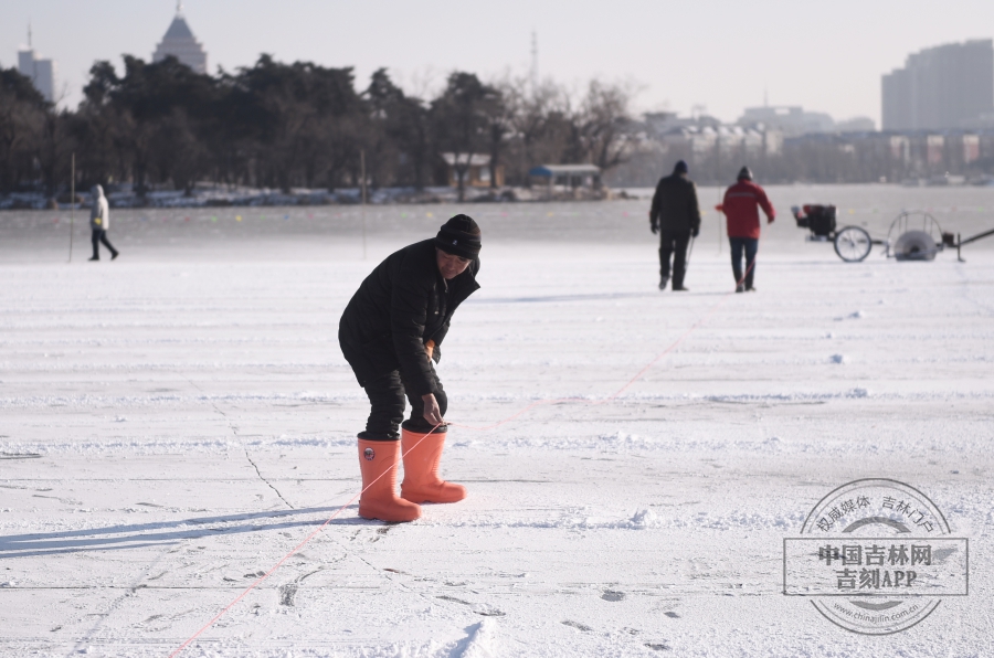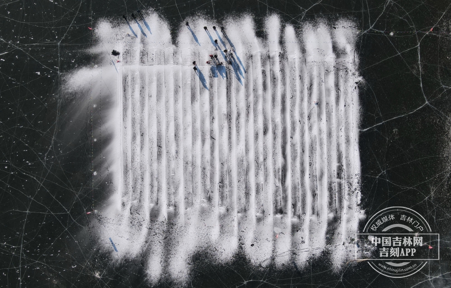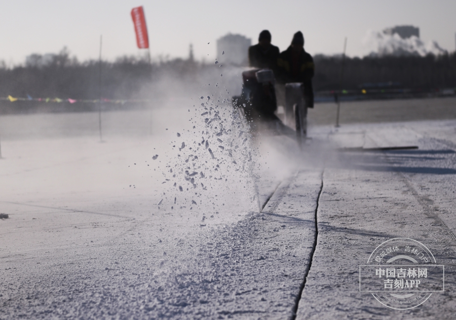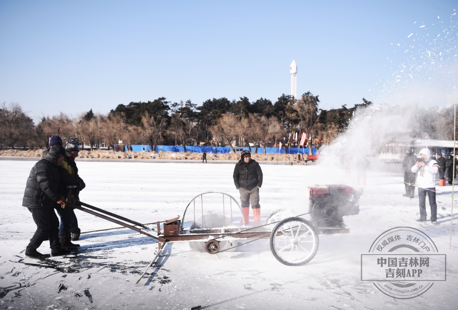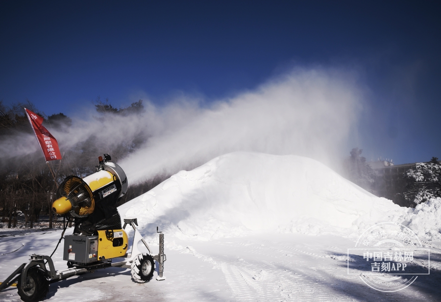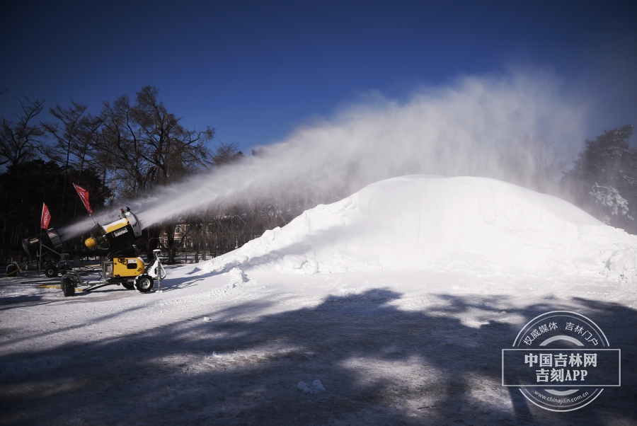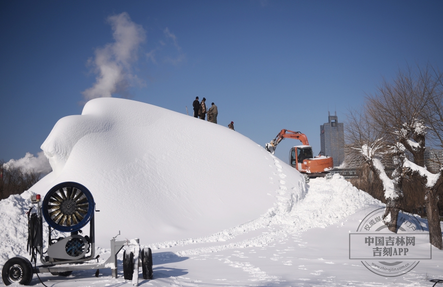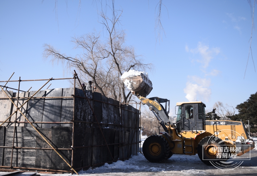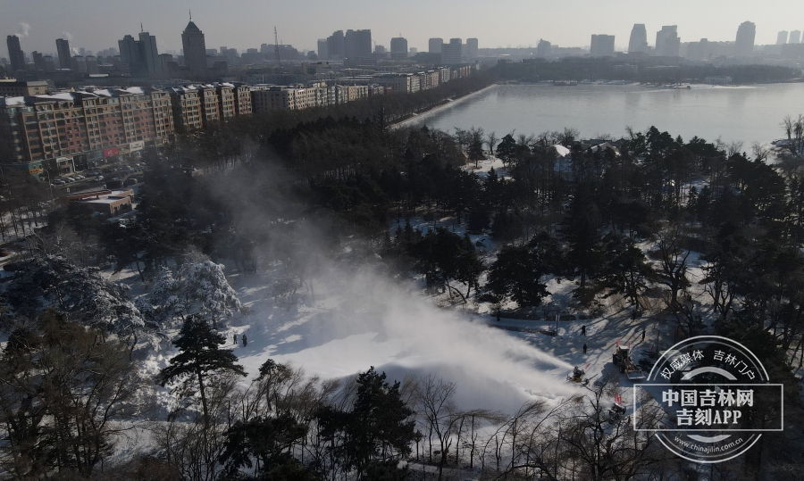 2020年12月14日,长春市南湖公园内二号门附近的一块空地上,两台造雪机不停地向上喷洒着人造雪,在前方不远处人造雪已堆成小山,两台铲车不停地将雪运送到公园内各处制作雪雕的地点。远处的湖面上拉起了警戒线,线内工人正在用切割机对冰面进行切割,之后会将切割好的冰块从湖中取出,送到长春市内的各个角落用来制作街路上的景观冰雕。