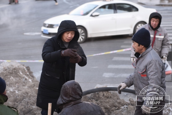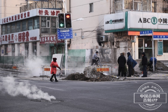 中国吉林网记者在现场看到,供热公司维修部门排除专业抢修队伍进行快速抢修,由于路口处地下管线复杂,加上冬季寒冷,抢修施工进程相对较慢,供热抢修工都是顶着水蒸气在地沟中忙碌着。
