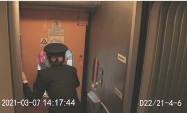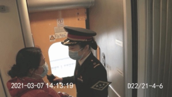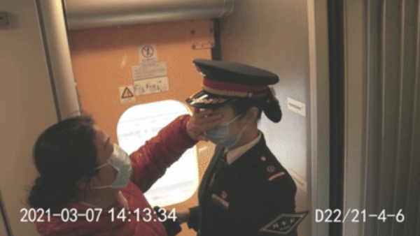 3月7日14点12分,北京至吉林D21次列车长春站到站前4、5车通过台处,一位女旅客抱住值乘的列车长相拥而泣。