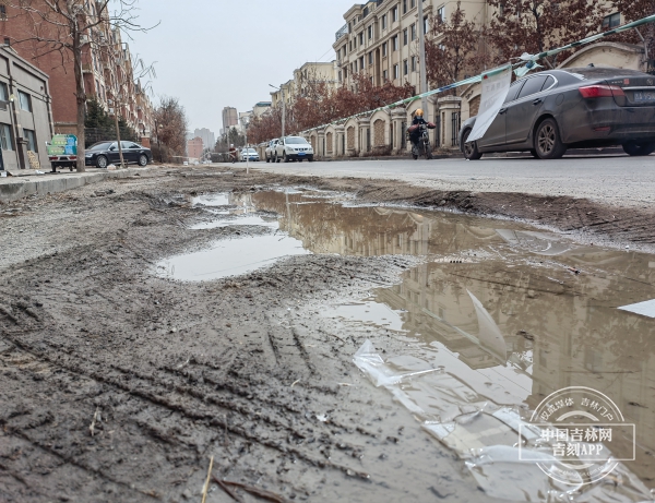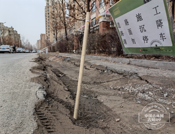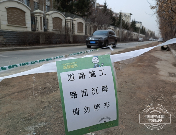 在中海国际社区E区和F区之间,这段被挖开的沥青路长约400米,宽约10米。但有一米多宽的路面没有硬覆盖, 部分路面凹陷,最深处有几十厘米,部分凹陷处尚有积水。网友说凹陷区域有车辆陷入,已经开走。但是仍有几 辆车停在凹陷路面上。这段没有硬覆盖的路拉起了警戒线,每间隔几米悬挂着温馨提示:道路施工,路面沉降, 请勿停车。上面公章上写着中海物业管理有限公司长春分公司国际社区橙郡管理处,有效期至2021年4月30日。