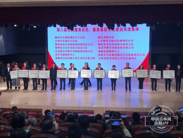 主办方向榆树市五棵树镇综合文化站、敦化市图书馆等13家吉林省荣获第八届全国服务农民、服务基层文化建设先进集体颁发了奖牌,鼓励引导广大文化单位和文化文艺工作者进一步做好基层文化工作,丰富广大基层群众精神文化生活。向吉林省图书馆、长春市委宣传部、吉林省全民阅读协会、四平市全民阅读协会、延边州全民阅读协会、辉南县全民阅读促进会等书香吉林文化服务小分队授旗,书香吉林文化服务小分队将奔赴乡村、社区、学校、企业传递书香、促进阅读。