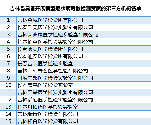 截至2021年9月13日,吉林省卫健委公布了具备新冠病毒核酸检测能力医疗机构和第三方机构的最新名单,其中医疗机构233家,第三方机构15家。