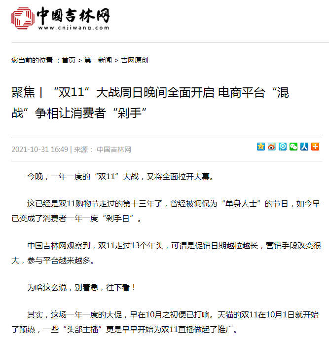 中国吉林网观察到,“双11”走过13个年头,可谓是促销日期越拉越长,营销手段改变很大,参与平台越来越多。淘宝天猫、京东等电商均从10月20日晚8点开启预售。天猫用户在“双11”期间可以买两波,11月1日至3日为第一波,11月11日为第二波购买日。第一波下单的消费者,能提前10天收到货。