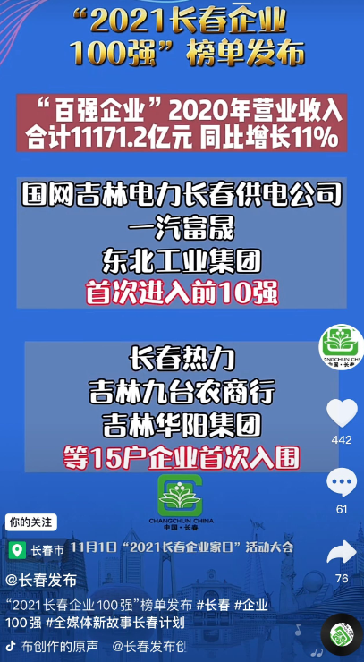 11月1日,在“2021长春企业家日”活动大会上,长春市企业联合会、长春市企业家协会发布了2021长春企业100强榜单及发展分析报告。