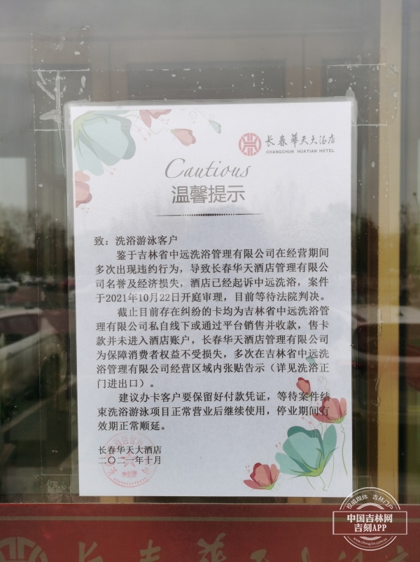 11月2日,中国吉林网来到位于长春华天大酒店院内的“中远洗浴”。现场,招牌依然悬挂,上面写着游泳、汗蒸、嬉水等项目,可大门已经紧闭,旋转门也已经用塑料封上,并上锁。门上有一张华天大酒店10月份张贴的温馨提示。