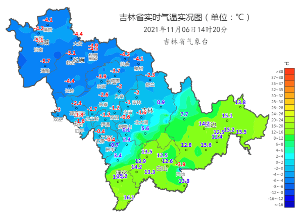 刚刚,中国吉林网从省气象台获悉,6日白天开始,我省气温自西向东明显下降,14时零度线压至辽源、吉林东部,长春市区14时气温为-2.8℃,与昨日14时相比下降了18.9℃;但我省的南部和东部目前气温仍较高,一般为2℃-16℃。