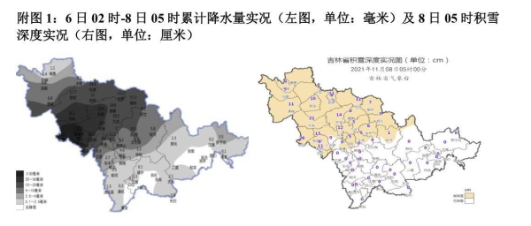6日凌晨开始,我省出现雨雪天气,7日白天到夜间出现强降雪,松原、长春西部、四平地区共13个市县出现暴雪,其中梨树、孤家子、长岭出现大暴雪,双辽出现特大暴雪。截至8日05时,全省平均降水量7.6毫米,地区分布:四平25.8毫米,松原17.5毫米,长春15毫米,吉林7.1毫米,辽源4.8毫米,白城4.3毫米,其他地区不足4毫米。雨雪量前五位:双辽37.3毫米,孤家子32.2毫米,梨树30.3毫米,长岭25.2毫米,农安23.5毫米。