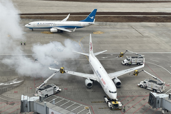 机场飞行区管理部全员备战,并连夜组织清雪作业人员对跑道、滑行道、机坪进行了清扫。由于本次降雪前期气温较高,后期降至零下,极易造成道面结冰现象,所以面临的除雪难度较大。清雪人员积极应对,连续奋战近48个小时,有效提高机坪扫雪效率,防止道面结冰影响飞行安全。此外,机务工程部共出动8台除冰车,对每架飞机实行原位除冰作业,增加现场除冰保障力量,做到提前沟通机组除冰需求,不断提升现场航空器除冰效率。航务部的气象人员,时刻关注天气状况,及时做好信息报送,机坪塔台加强了与航空公司、空管的联系和协调,有序安排航班放行次序,全力争取临界航班放行正常。现场指挥人员持续优化机坪运行流畅,并及时沟通相关部门对降雪时段的航班进行调减、调时,全力确保本场航班有序顺畅放行。