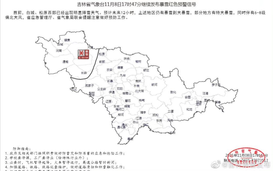 吉林省气象台11月8日17时47分继续发布暴雪红色预警信号:目前,白城、松原西部已经出现明显降雪天气。预计未来12小时,上述地区仍有暴雪到大暴雪,部分地方有特大暴雪,同时伴有6-8级偏北大风,省应急管理厅、省气象局联合提醒注意做好预防工作。