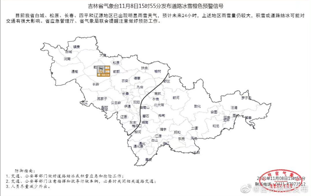 吉林省气象台11月8日15时55分发布道路冰雪橙色预警信号:目前我省白城、松原、长春、四平和辽源地区已出现明显雨雪天气,预计未来24小时,上述地区雨雪量仍较大,积雪或道路结冰可能对交通有很大影响。省应急管理厅、省气象局联合提醒注意做好预防工作。