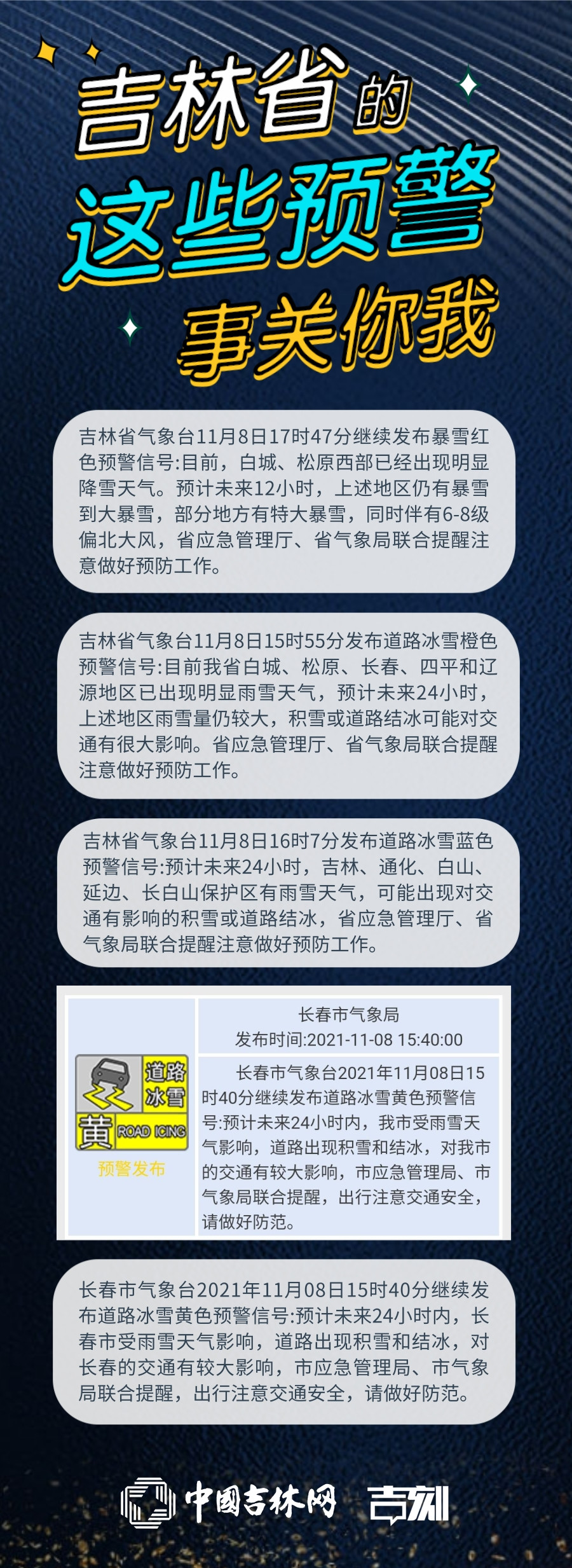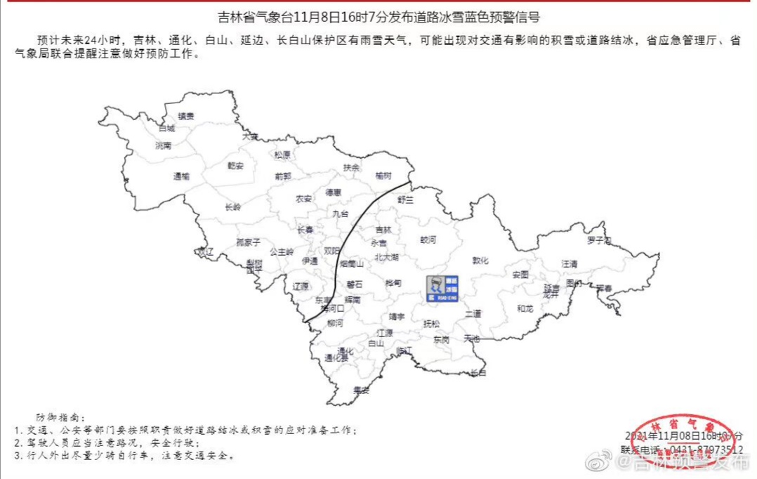 吉林省气象台11月8日16时7分发布道路冰雪蓝色预警信号:预计未来24小时,吉林、通化、白山、延边、长白山保护区有雨雪天气,可能出现对交通有影响的积雪或道路结冰,省应急管理厅、省气象局联合提醒注意做好预防工作。