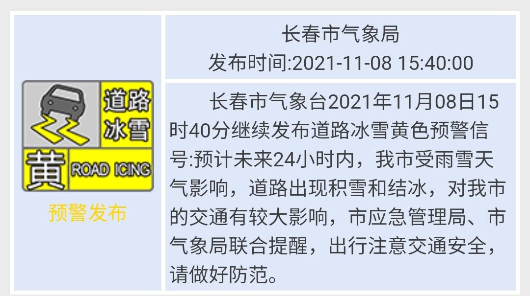 长春市气象台2021年11月08日15时40分继续发布道路冰雪黄色预警信号:预计未来24小时内,长春市受雨雪天气影响,道路出现积雪和结冰,对长春的交通有较大影响,市应急管理局、市气象局联合提醒,出行注意交通安全,请做好防范。
