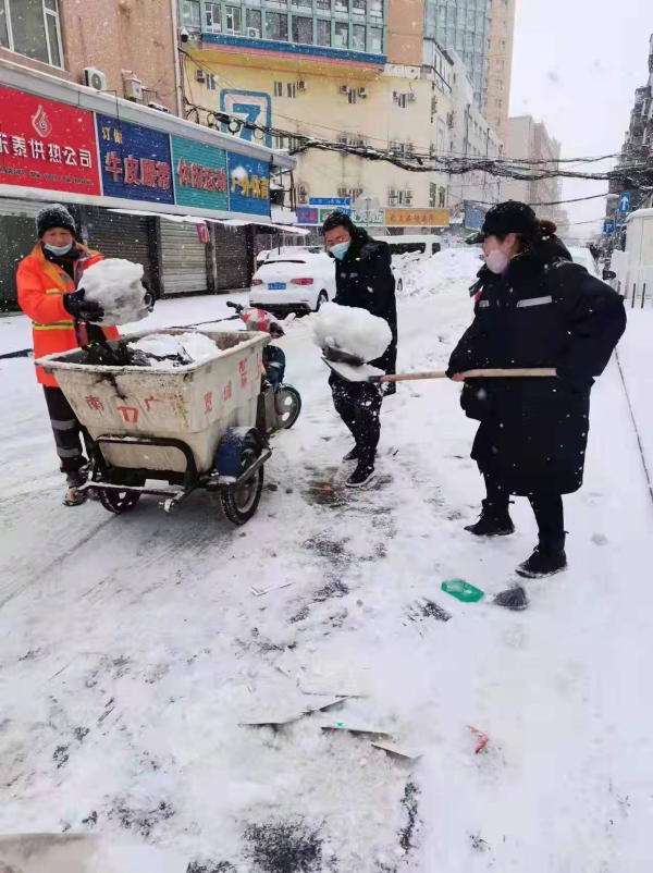然而,停车路段收费停止了,现场宣导工作人员的工作并未停止。只不过,此时他们的工作变成了公益服务,配合环卫工人、商户、车主清雪。