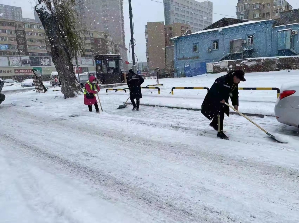 中国吉林网了解到,从8日起,长春城投智慧城建科技有限公司的86名运营管理人员一直坚守岗位,用铁锨、扫帚等工具将车位和道沿上的积雪进行清理。同时,为车主、商户排忧解难,刨冰、除雪、推车、清障。