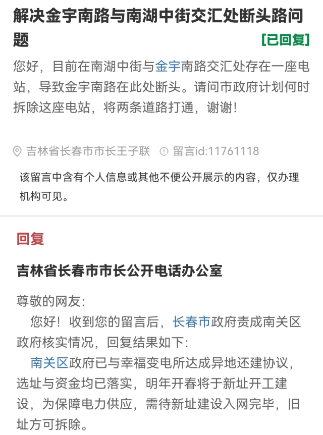 长春市市长公开电话办公室回复, 南关区政府已与幸福变电所达成异地还建协议,选址与资金均已落实,明年开春将于新址开工建设,为保障电力供应,需待新址建设入网完毕,旧址方可拆除。