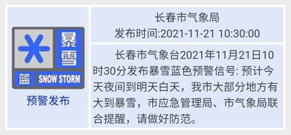 长春市气象台2021年11月21日10时30分发布暴雪蓝色预警信号:预计21日夜间到22日白天,长春市大部分地方有大到暴雪,市应急管理局、市气象局联合提醒,请做好防范。