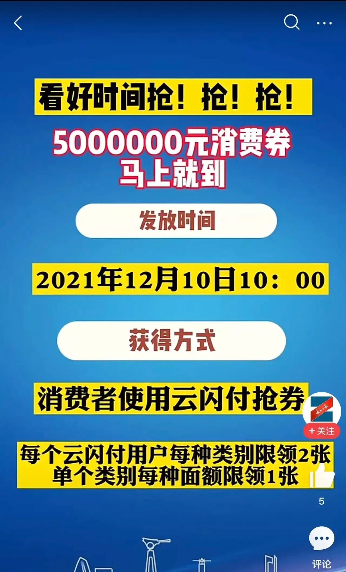 活动将于2021年12月10日上午10点开始,发放总额为500万元的“聚惠暖冬”商业消费券。消费者们可使用云闪付抢券。
