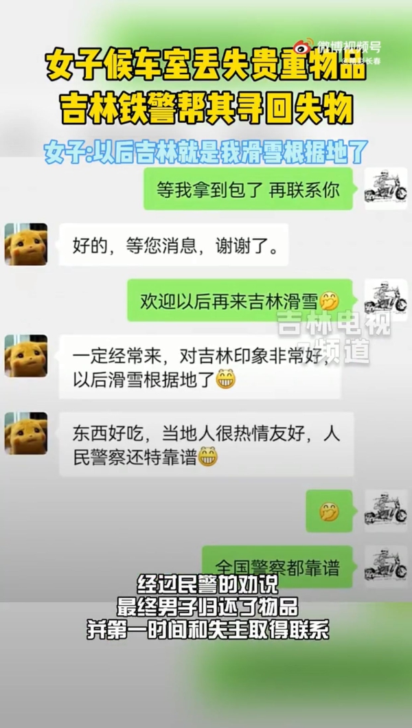 近日,从上海来到吉林滑雪的康女士不慎将贵重物品遗失在候车室,吉林市火车站民警接到报警后立刻行动,锁定了捡走物品的男子并将贵重物品追回。