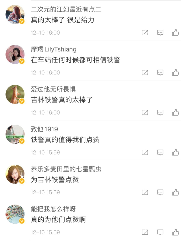 网友“养乐多麦田里的七星瓢虫”:“为吉林铁警点赞!”