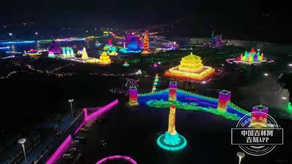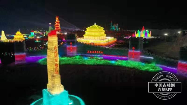 雪雕、彩灯照亮了夜空
