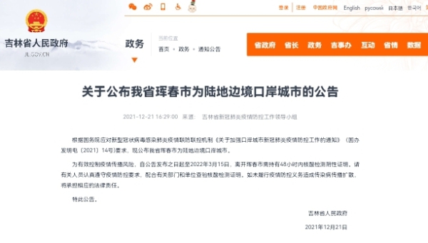 21日,中国吉林网从吉林省人民政府网站了解到,吉林省人民政府发布《关于公布吉林省珲春市为陆地边境口岸城市的公告》。根据国务院应对新型冠状病毒感染肺炎疫情联防联控机制《关于加强口岸城市新冠肺炎疫情防控工作的通知》(国办发明电〔2021〕14号)要求,现公布我省珲春市为陆地边境口岸城市。