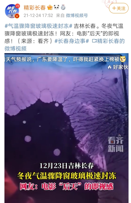 吉林长春。冬夜气温骤降窗玻璃极速封冻!网友:电影《后天》的即视感!