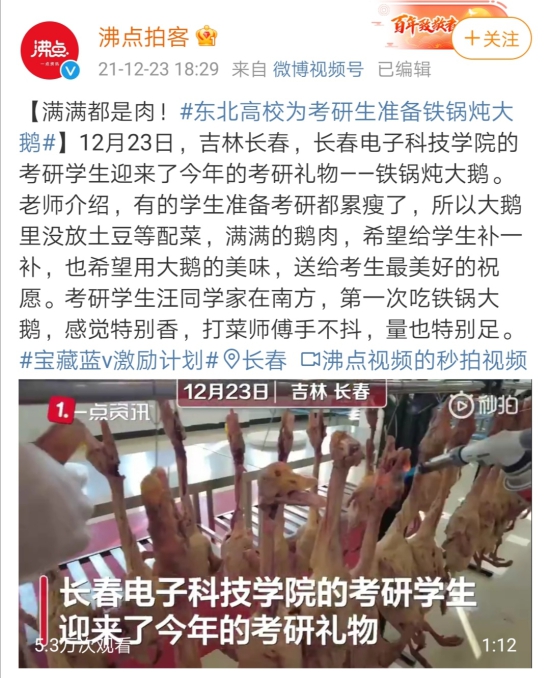 12月23日,吉林长春,长春电子科技学院的考研学生迎来了今年的考研礼物——铁锅炖大鹅。老师介绍,有的学生准备考研都累瘦了,所以大鹅里没放土豆等配菜,满满的鹅肉,希望给学生补一补,也希望用大鹅的美味,送给考生最美好的祝愿。考研学生汪同学家在南方,第一次吃铁锅大鹅,感觉特别香,打菜师傅手不抖,量也特别足。