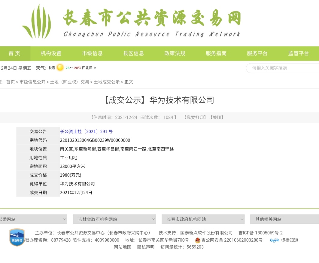 12月24日,长春市南关区一处工业用地成功出让,地块具体范围是东至新明街,西至华昌街,南至丙四十路,北至南四环路,占地面积3.3万平米,最终被华为技术有限公司以1980万元的价格摘得。