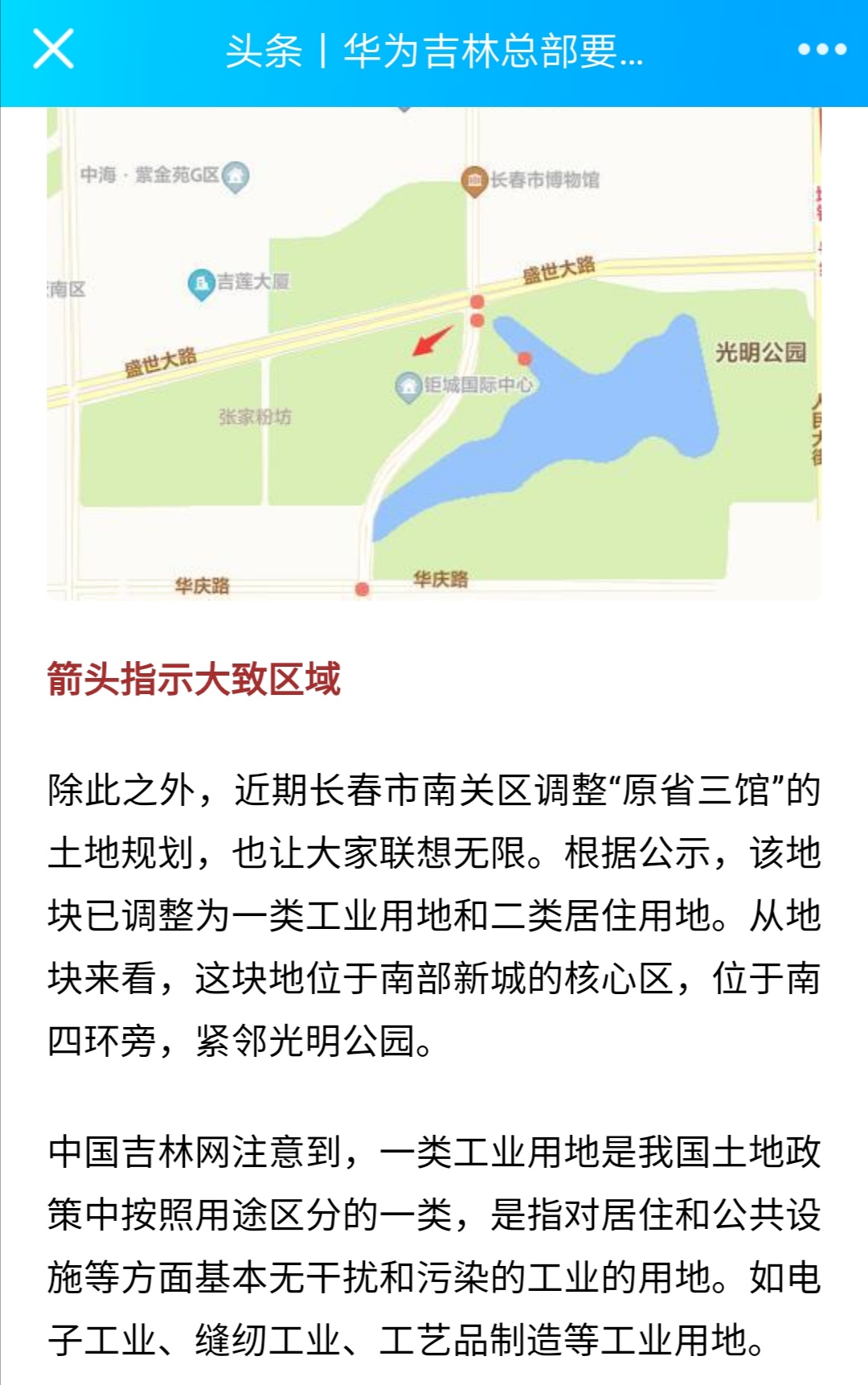 今年4月,中国吉林网曾刊发《华为吉林总部要落在这儿?》一文,深度聚焦华为与吉林“握手”背后选址落位。期间,叠加多重信源,预测位置与华为技术有限公司今日所拍区域范围“不谋而合”,就是本网此前提到的紧邻光明公园旁边的地块。