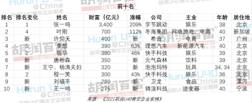 5位新人进入前十,以快时尚跨境电商平台希音37岁的许仰天为首,其次是元气森林39岁的唐彬森,泡泡玛特34岁的王宁、杨涛夫妇,卫龙食品39岁的刘福平,光伏设备企业锦浪科技40岁的王一鸣。
