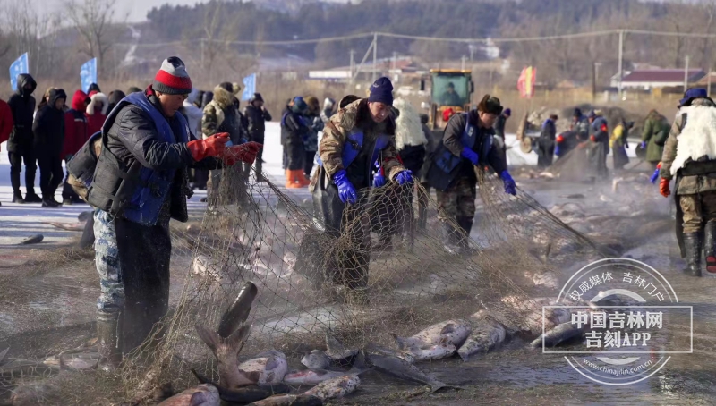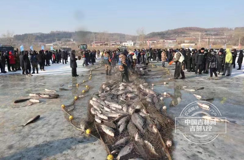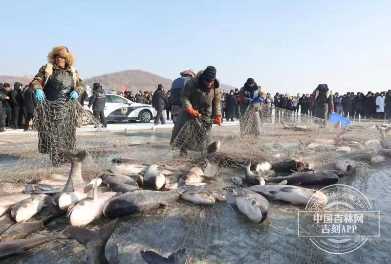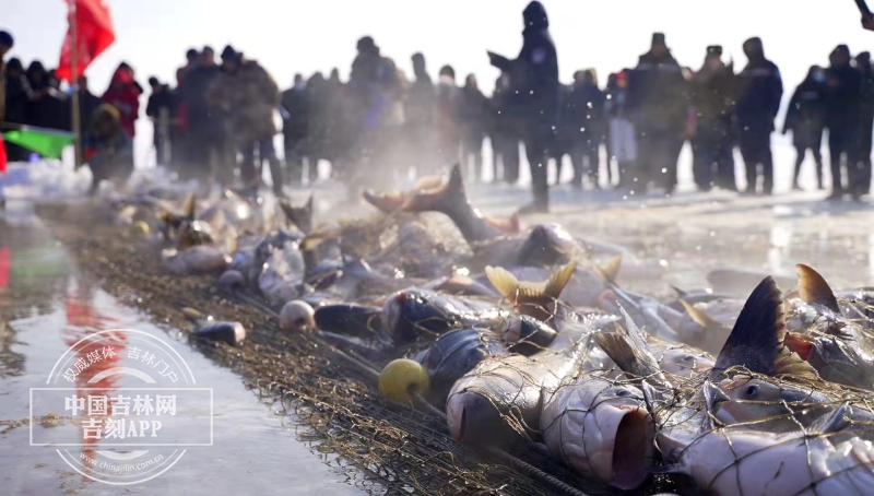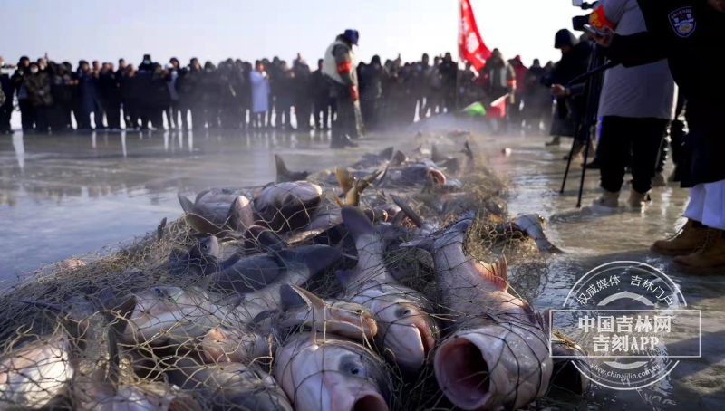 12月29日,位于长春市九台区的长春市石头口门水库冰面的冬捕现场人头攒动,万鱼腾跃。长春市最大淡水供给地石头口门水库冬捕活动正式拉开大幕。在“渔把头”的指挥下,渔民们协同机械合作升起了第一网,成千上万条大鱼一跃而起。数以千计的游客,分享丰收“鱼跃”的这一刻,喜迎新年到来。