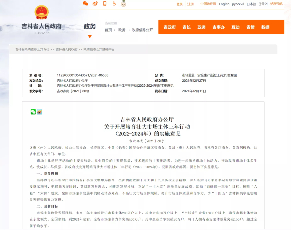 中国吉林网从吉林省人民政府网站了解到,吉林省人民政府办公厅发布《吉林省人民政府办公厅关于开展培育壮大市场主体三年行动(2022-2024年)的实施意见》(下称《实施意见》)。