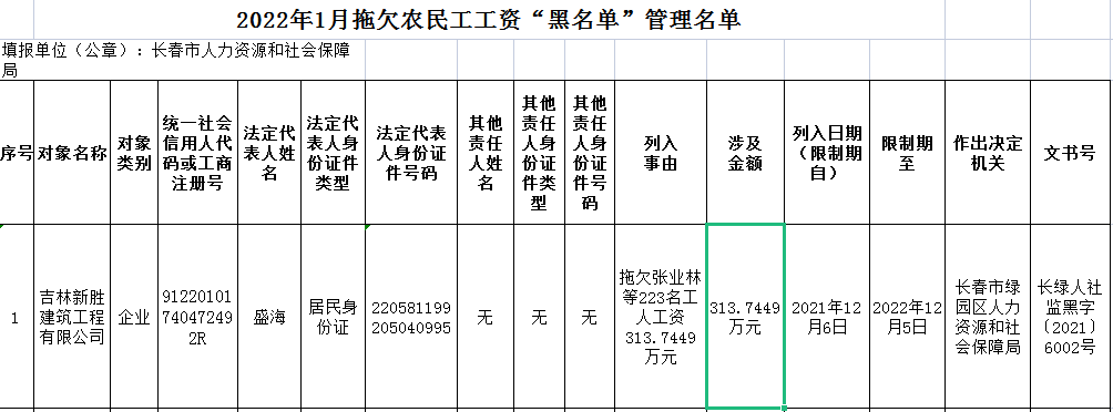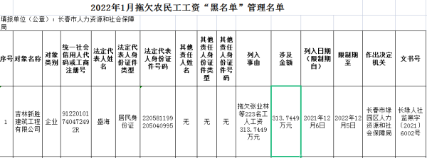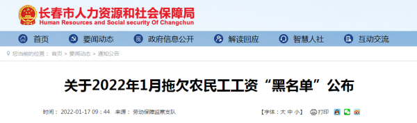 17日,中国吉林网从长春市人力资源和社会保障局了解到,长春市人力资源和社会保障局公布2022年1月拖欠农民工工资“黑名单”。