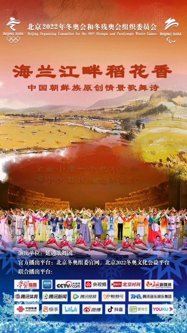情景歌舞诗《海兰江畔稻花香》展现了朝鲜族人民在党的好政策指引下,边疆稳固、经济发展、社会进步、民族团结的美好画卷。