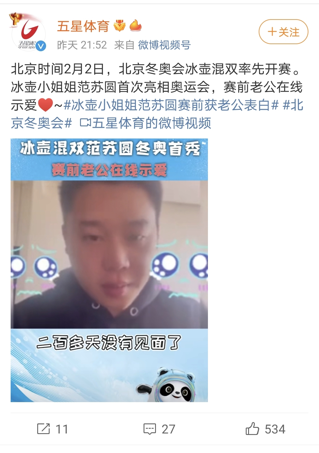 在范苏圆首战瑞士选手前,丈夫陈子昂通过社交网络发布一段暖心小视频示爱。他说为了备战北京冬奥会,夫妻俩已经200多天没有见面了,希望范苏圆摆平心态顽强拼搏,等冬奥会后一定为妻子补办一场盛大的婚礼,“媳妇儿,加油!”