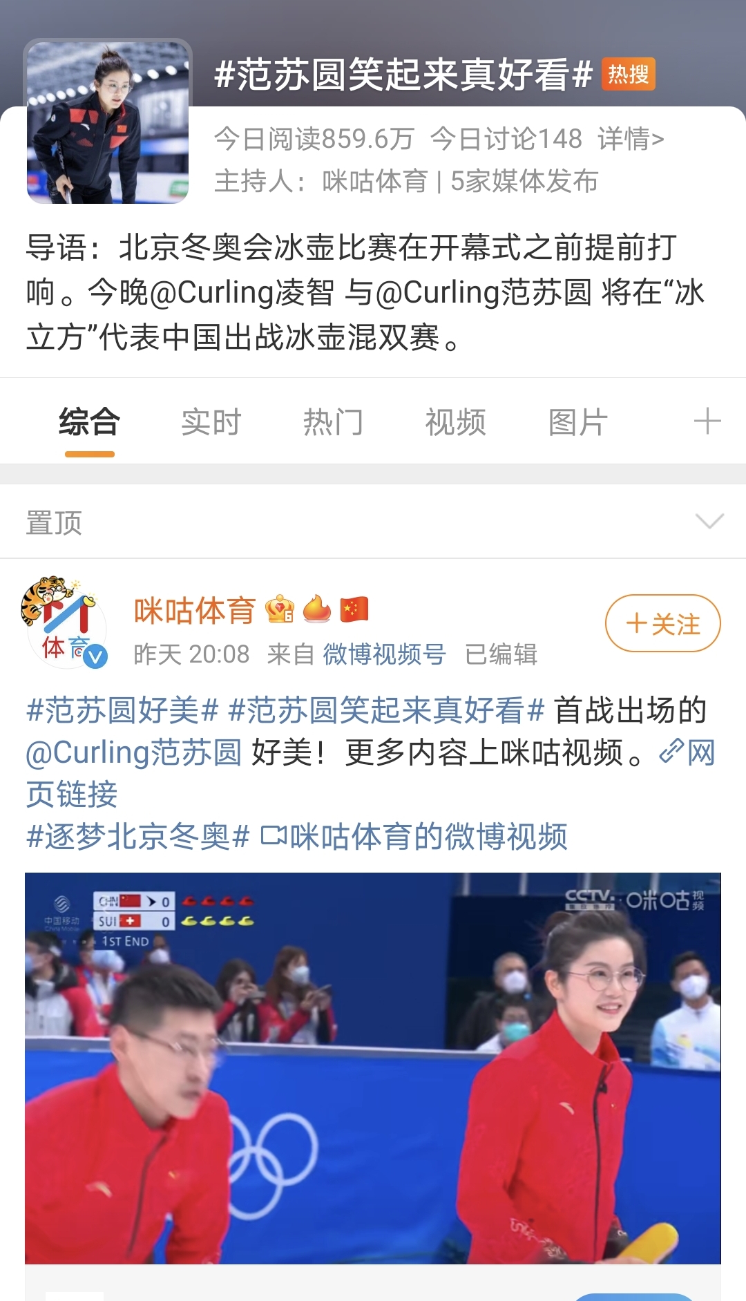 范苏圆/凌智这对混双组合冰壶选手都是第一次参加冬奥会,他们一出场便开始“圈粉”,不仅成绩出色,而且两人颜值都非常能打。不少网友说:“范苏圆好美。”