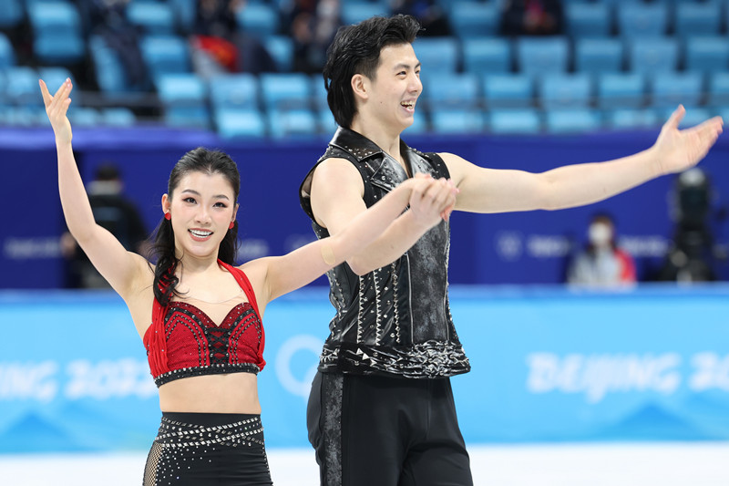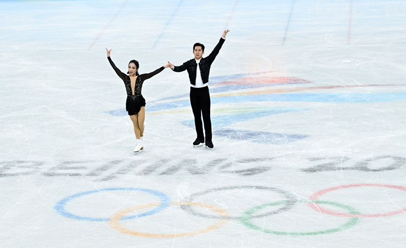 2月4日,中国选手隋文静(左)/韩聪在北京2022年冬奥会花样滑冰团体赛双人滑短节目比赛中。新华社记者马宁摄