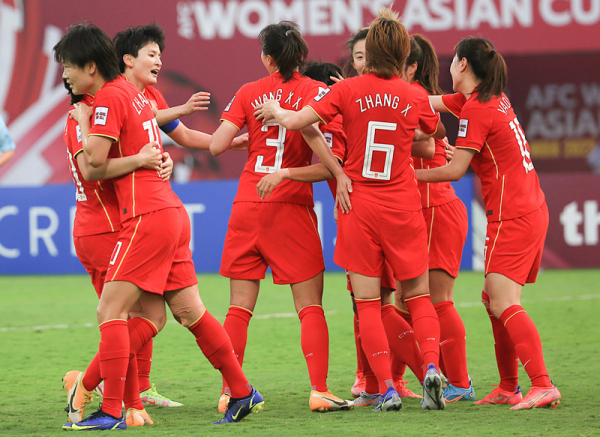 2月6日,中国队球员在比赛中庆祝进球。当日,在印度孟买举行的2022女足亚洲杯决赛中,中国队以3比2战胜韩国队,夺得冠军。新华社发(贾韦德·达尔摄)