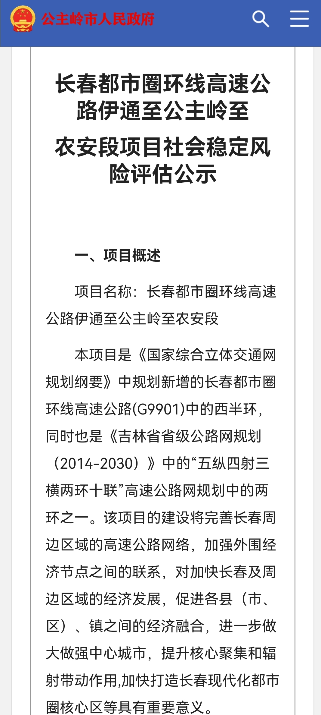 近日,中国吉林网获悉,公主岭市人民政府发布了长春都市圈环线高速公路伊通至公主岭至农安段项目社会稳定风险评估公示。